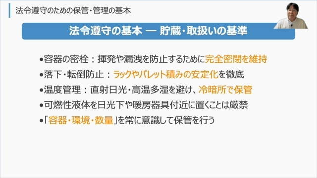 倉庫では多様な危険物を扱うため、保管方法を誤ると大規模な火災や爆発につながります。本講義では、事故を防ぐために必要な法令の正しい理解と、日常業務で役立つ保管・管理の要点習得を目指します。